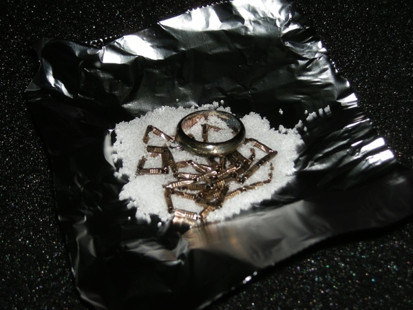 首先將要洗的銀器放入裝了鹽巴的鋁箔紙上